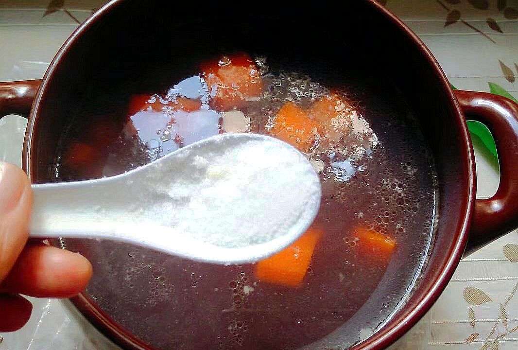6.慢火熬煮45分钟后下人胡萝卜和玉米