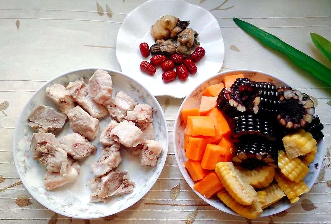 甜糯黑玉米 两条、胡萝卜 一条、甜糯黄玉米 一条、排骨 350克、蚝豉 5个、阿胶枣 六个、姜 20克、冬季干燥,就喝这养生汤,比“神仙水”还管用精盐 6克、昆布粉 少许