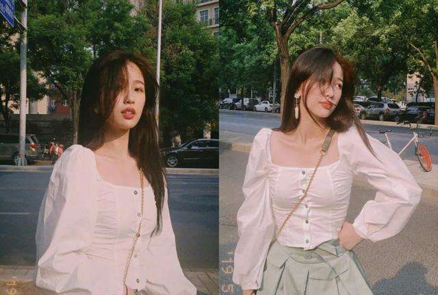 大家有没有发现欣欣子特别喜欢白色上衣?没错,那就是因为白色真的超百搭呀,一点点小小的点缀就可以搭配出不同的各种风格。这件稍微有点泡泡袖的方领上衣将虞书欣的直角肩和锁骨展现出来,夏天就是这样的风格呀!下面一条薄荷绿裙子衬得虞书欣更加白皙,微微收腰让她的比例也更加凸显,背一个同色系清新的包包让穿搭更加完整。今夏必火的法式风姐妹们一定要学起来呀~