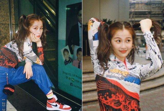 其实欣欣子平时穿的都是比较偏甜美鬼马少女感的衣服,很少看到有这张照片中的这类穿搭,整体的颜色搭配非常完美,是蓝红的撞色搭配,非常和谐。上衣是一件高领的印花紧身上衣,把欣欣子的身材曲线显现出来,紧身的衣服有一个优点就是可以让身材显得更加纤细,下身一条百搭深色牛仔裤怎么搭都不会出错,但是姐妹们要注意,上身紧的话下身可以稍微搭配宽松一点的裤子。逛街当然必备AJ呀,以及腰间的挎包也搭配得很相衬。