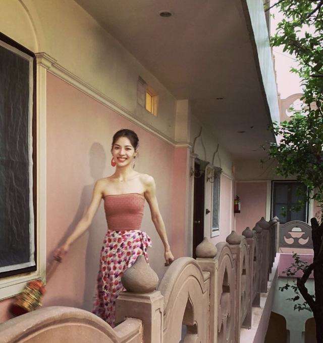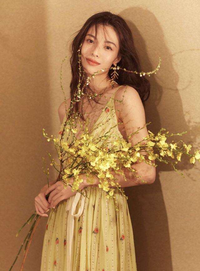 夏天度假休闲都特别流行穿长裙,她身上的这一款淡黄色的吊带长裙就是非常优雅的,而且也是让人一眼就能够注意到的。首先颜色上非常的清新淡雅,而且花色也不是简约的,而是有一点小设计的碎花裙。