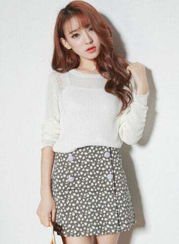 第二,A字裙搭配收身的针织衫T恤,T恤可以是那种波浪边的领口。一般来讲,因为这种A字裙是比较散开一点的版型,所以我们选择一个紧身一点的针织衫,取得的整体服装搭配效果会更好一点点。
