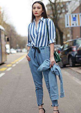 一条浅色的紧身九分牛仔裤,搭配一个蓝白色条纹衬衫,潮流前线,整体服装搭配的色彩层次非常的强,具有非常强的时尚感。这个搭配非常适合比较年轻一点的女性,适合在外出游玩或者逛街时穿。女士衬衫的搭配方法和技巧
