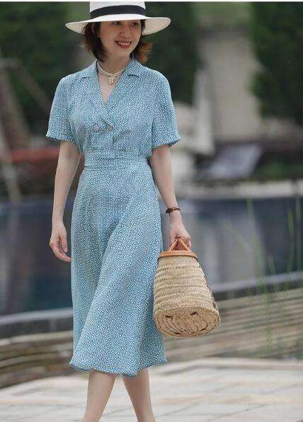 对于40多岁的熟龄女性来说,好穿又好看的连衣裙会特别适合你们,连衣裙是最不用费心思去搭配的单品,直接单穿就可以很美,当然也要懂得挑选适合自己的连衣裙,像这款连衣裙就很适合40岁+的熟龄女性,以清新的浅蓝色为基调,点缀了复古的格纹印花,穿起来清新减龄又不失优雅知性范。双排扣西装领的设计既能够延长颈部线条,又表达出了几分职场精英气质,显得轻松又不放肆。同色系腰带既强调整体感,又能够凸显腰身改善身材比例。脚上再搭配一双杏色的尖头粗跟单鞋,上脚显得气质知性,粗跟的款式又能够保持舒适感。
