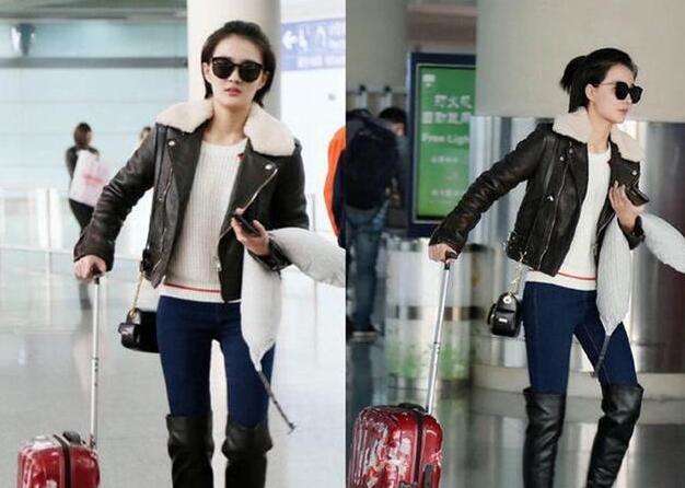 相对硬朗的轮廓,酷酷的线条,自带叛逆属性是机车皮衣的特点。帅气的机车服不再搭配百褶裙,而是与深蓝色紧身打底裤and过膝靴,过膝靴怎么搭配衣服组合成“娘man”风,徐璐这一套look真的是撩妹无数了!