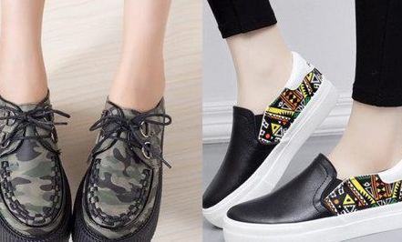 还有比较有个性或者凸显气质的松糕鞋款式就是如下图所示的这种了:左边这款是迷彩面松糕鞋,相对较为个性,很适合那些追求与众不同的女孩子,这款鞋子可以试着搭配宽松简单的黑色长裤,会显得比较有气质。而右边这款松糕鞋就相对更加适合成熟一点的女生了,这款松糕鞋是皮面与布面拼接款式,其特点就是可以显得人更加时尚休闲。