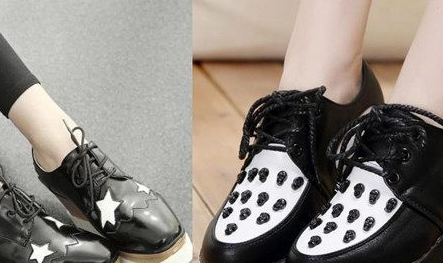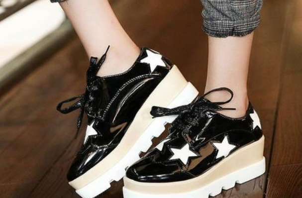 但是要说到松糕鞋中比较时尚的一些款式就是如下图所示的这种较富有设计感的样式了。上图所示的这两款都是缀有图案装饰的:比如上图左边这款有星星图案的设计就显得整款鞋子比较偏时尚个性风格了。这款鞋子比较适合搭配紧身长裤哟!