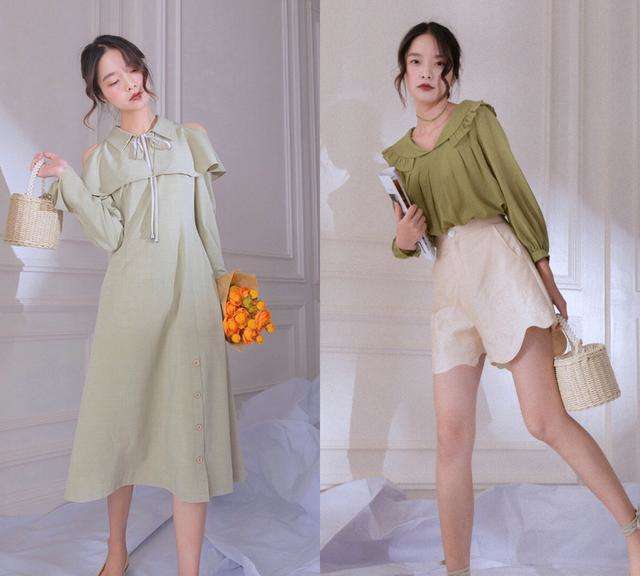 绿色的连衣裙更适合轻熟的女人日常穿搭,轻熟女穿搭有减龄的效果,小露肩和收腰的设计,能够穿出女人柔美大方的一面,搭配一双平底鞋,十分显气质。