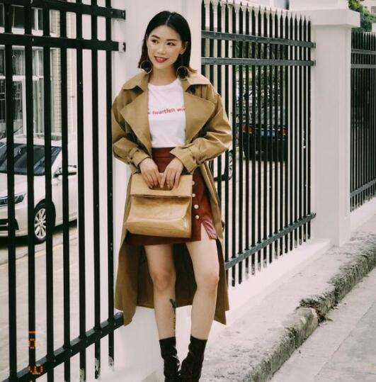 风衣搭配裤子有点腻,不如尝试一下搭配酒红色的短裙,搭配尖头的裸靴,衬托纤细的腿部,再搭配大圆耳环,又酷又帅气。