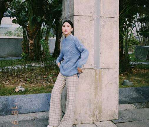 蓝色毛衣+格纹长裤,快及地的长度与宽松的毛衣,营造出大长腿,又显慵懒,色调明亮却又温暖,小小的耳饰丰富了整个look的精彩感。