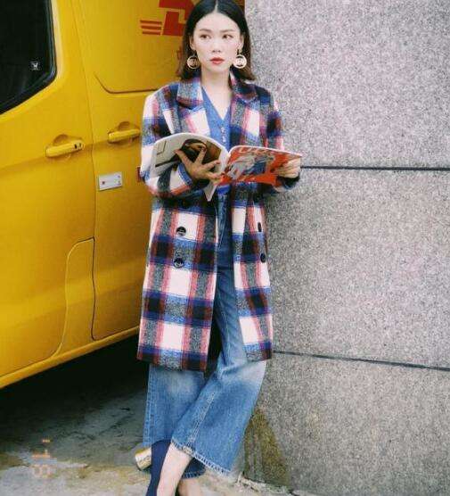 有时候除了色彩的碰撞之外,小配饰增添的细节感也不容小觑,蓝色阔腿牛仔裤+粉蓝色格纹大衣,搭配圆形金属感耳环,精致大方,鞋跟的金属色与耳环遥相呼应。