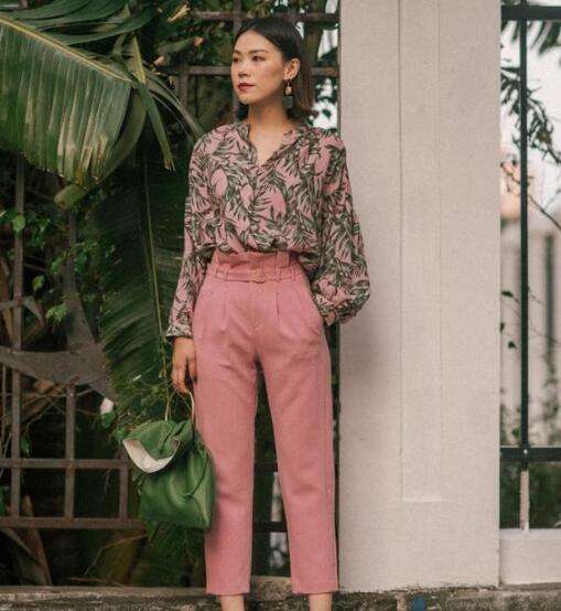 今年很流行莫兰迪色系,粉色的直筒裤+绿色融合粉色的衬衣,再搭配绿色的小包,清新淡雅,又兼具复古气息,颜色的大碰撞,是最快速吸引眼球的穿搭。