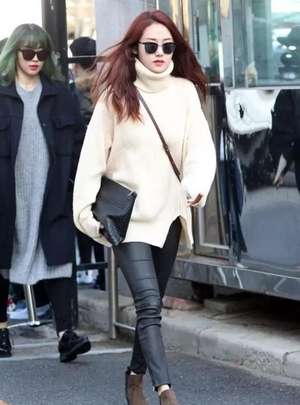 Oversize高领针织毛衣+紧身皮裤+啡色短靴