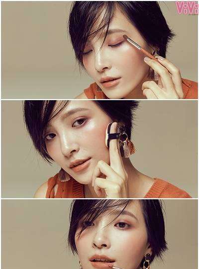眼彩是使用橘色和偏红色的眼影堆叠中,只需淡淡地上色,重要的是维持肌肤透亮的质感。