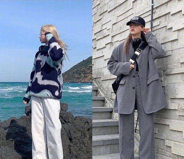 套装搭配看起来比较慵懒,属于比较潮的搭配。不同于以往搭配,宽松的裤子看起来垂感很强,但是却是比较新潮的一种美。