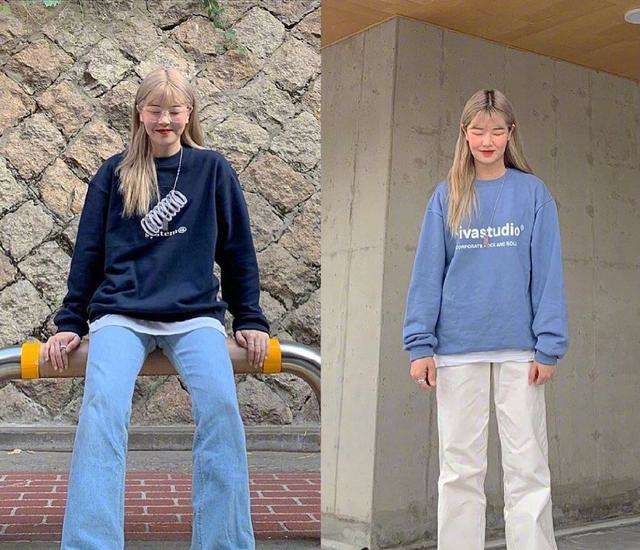 蓝色的卫衣看起来比较利落,给人一种干净简洁的感觉。外加下身的白色直筒裤,也是非常的活力阳光呢,这样青春的搭配在女人的衣橱应该多添置几件。