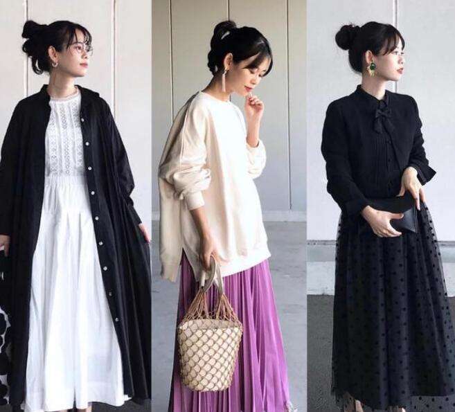 超爱这组搭配,简约舒适又不失气质感。黑色的长款风衣搭配白色长款连衣裙,黑白色的搭配永远都是经典不过时的组合,看起来简约又大气。杏色的中长款卫衣搭配紫色百褶半身长裙,清新浪漫,再配上一对长款耳环,更显得精致。我最爱的就是最后这套搭配,黑色衬衫式连衣裙看起来气质又知性,下摆网纱质地的设计,又能够削弱黑色带来的沉闷感。再配上一对绿宝石耳环,显得精致高贵,散发着成熟女性的魅力。