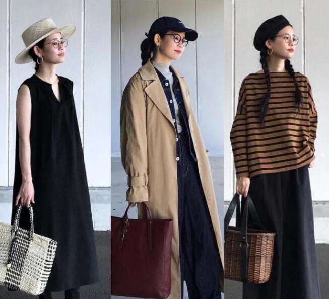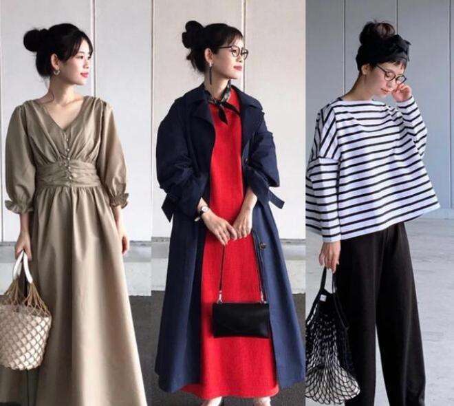 日系穿搭上身会显得特别的慵懒舒适,所以很适合需要兼顾事业与家庭的忙碌女性,一套充满舒适感的穿搭,会让你身心都放松。卡其色的长款收腰连衣裙,上身显得简约随性,收腰的设计又能够改善身材比例。深蓝色的长款风衣外套内搭红色连衣裙,高级又洋气,再搭配一条小丝巾,更显得精致知性。最后一套也是休闲风的穿搭,宽松的条纹T恤搭配黑色休闲裤,穿出简约又舒适的感觉。