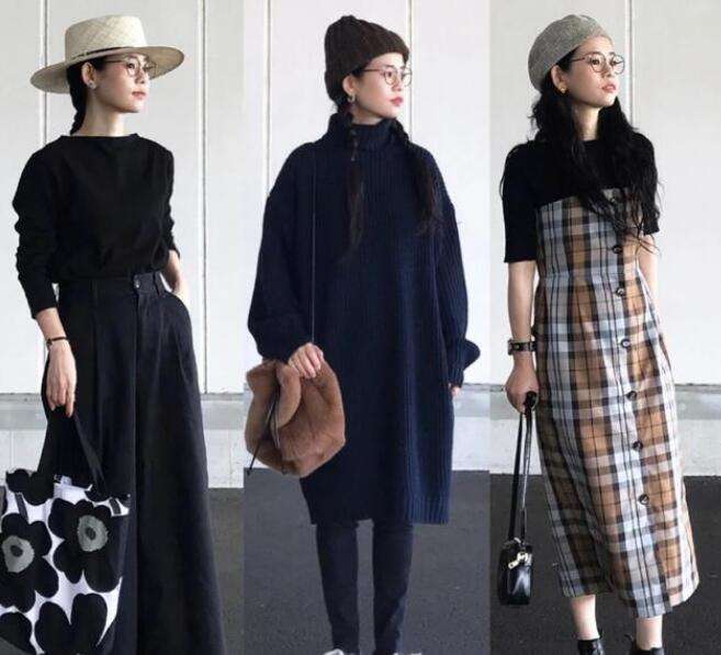 作为一名超级迷恋日系风格的女生,总觉得日系风有一种魔力,每套搭配拆分开来都是简单普通的单品,但是搭配起来却会显得特别的高级气质。就像这组搭配,简单的黑色长T搭配一条高腰黑色阔腿裤,高级又大气,再配上一顶浅色礼帽,平添几分优雅感,也会使得整套搭配更具有色彩。深蓝色大版上衣搭配黑色小脚裤,慵懒随性,舒适又自在。这款拼接的连衣裙看起来更有层次感,黑色与格纹的拼接,上身显得气质又不失清爽范。