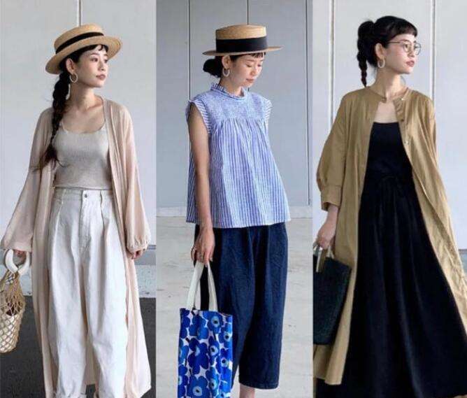 这组搭配也特别好看,清新的配色更加适合夏天。一件轻薄的防晒长款开衫内搭杏色吊带再搭配一条白色休闲阔腿裤,整套搭配显得温柔又清新,显得很有女人味。浅蓝色的条纹无袖上衣搭配深蓝色的休闲阔腿裤,穿出清爽又舒适的感觉,不过身材不是很好的女生尽量不要尝试,容易显矮。最后一套搭配,外套选择一件卡其色的风衣,内搭黑色吊带连衣裙,休闲舒适又不失高级感。