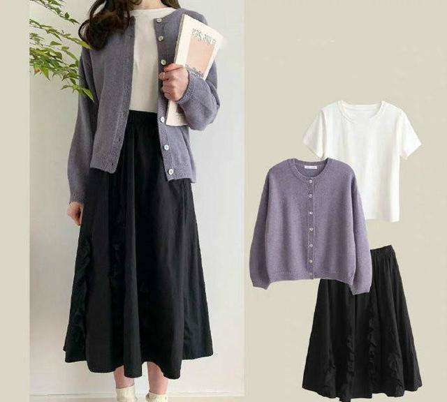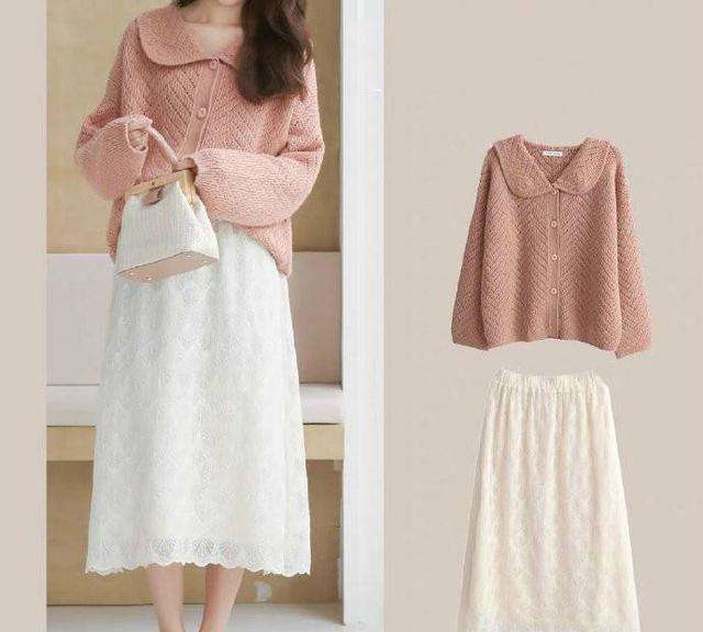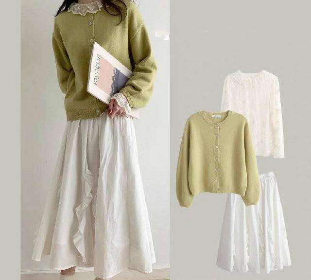 白色百褶裙不论是搭配橄榄绿还是淡淡的黄色都是非常的青春减龄了,开衫毛衣本来就带有随性慵懒的特质,再搭配上休闲的半身裙,文艺小清新风格穿搭图片显得随性洒脱,再配上领口的蕾丝边,青春气息和文艺气息十足,但是这种颜色和设计更适合年龄比较小的女生,年龄偏大的女生穿着可能就有一丝违和了。