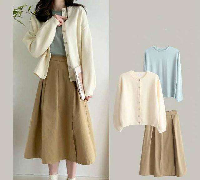 想要散发浓浓的文艺气息,怎么能少了这种淡黄色纺布面料的半身裙了,相信大家对这件单品并不陌生,运动方式,也是非常的实用百搭,褶皱的设计使得整个裙子不那么单调乏味,搭配上素雅干净的米杏色开衫毛衣,显得乖巧又甜美,内搭低调内敛的莫兰迪色系,整个人显得素净又文艺。