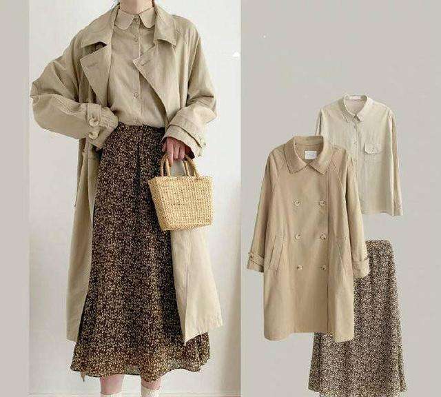 担心暗沉的碎花半身裙会显得老气,就选择用浅色来中和平衡,上衣也是能够决定服装风格的整体走向的,翻领的设计不会让你显得职业,相比剪裁更加挺括的风衣,这件风衣弱化了肩部线条,显得更加休闲与随意,在简约中多了一丝知性优雅。