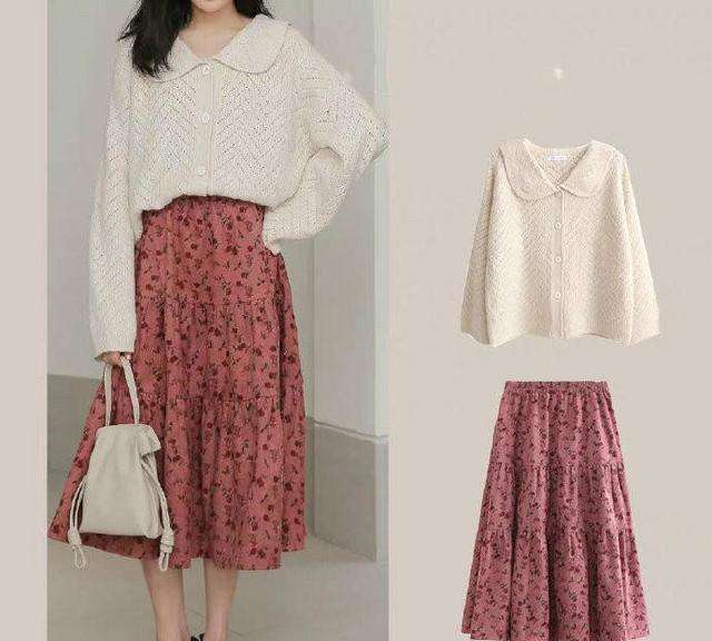 碎花是文艺、清新 的代表元素,不规则的碎花排列,增加了一丝随意感,蓬蓬的裙子,灵动飘逸,配上柔和的浅白色,文艺气息十足,浅白色毛衣的荷叶边设计,也是十分的减龄,想要打造文艺气息,就可以选择这种碎花元素或者带有荷叶边的设计,而这里 ,更是把两者结合在一起,既文艺复古,又显得清新甜美。