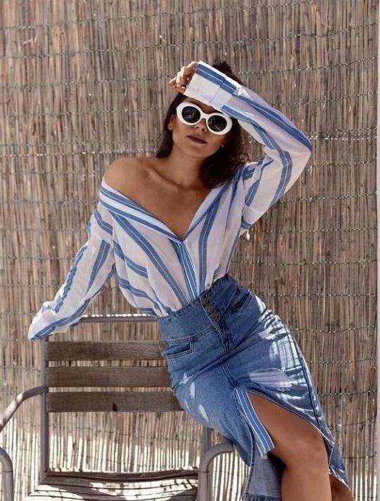竖条纹是两个或两个以上不同颜色纵排列的花纹,条纹可粗可细。不管是裙子还是裤子,竖条纹的做为衣服的元素,看起来很显瘦而且很高。竖条纹越粗,拉长局部效果越明显,如果越细,给人的感觉就有点显肉肉,微胖女孩应该避开。