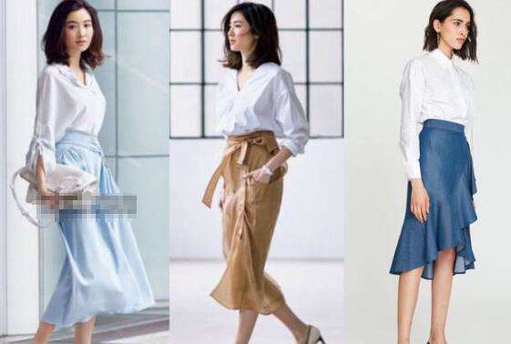 半身裙配衬衫特别适合职场的女性,干练柔美的气质不带任何攻击感,出入办公室适宜得体。白色衬衫配浅蓝色半身裙,质感的大地色半身裙优雅又清新;