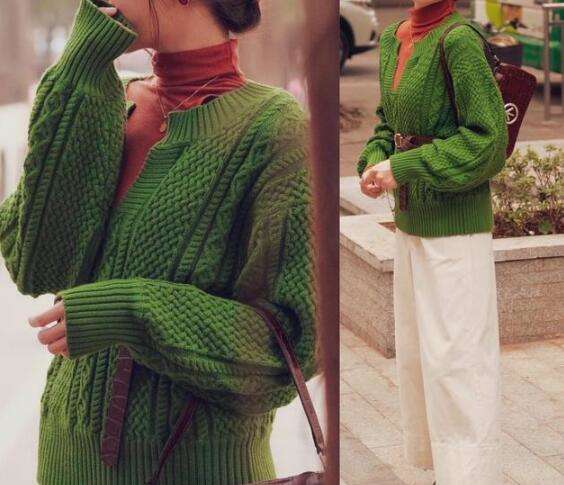 同样是绿色的毛衣,下面这是绿色的粗毛衣,重要也是叠穿,内搭已经是棕色,裤子是纯白色宽松的直筒裤,比拟寻常的玄色裤子,愈加明艳少许。这一套直接鉴戒的是腰带,很精巧的行使腰带拉高了腰线,显得腰又细腿也长,腰带的材质与复古的皮质包包和皮鞋很好的照应。搭配出了港风复古都觉得。配上能够选取少许复古的耳钉和毛衣链。