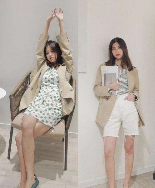 同色系叠穿准则,可能更好地维系视觉的团结性,不会有愈加凌乱的感受。抢这种卡其色的西装外衣,正在采选内搭的功夫也是较量百搭的。浅卡其色的西装外衣,搭配了深卡其的衬衫,也属于一种同色系的搭配体例。只是深卡其衬衫之内搭配了白色T恤,白色的T恤与白色歇闲短裤正在色系上维系了相仿。云云的穿搭,也是最经典的同色系内搭体例,显现出愈加温柔尊贵的气质。