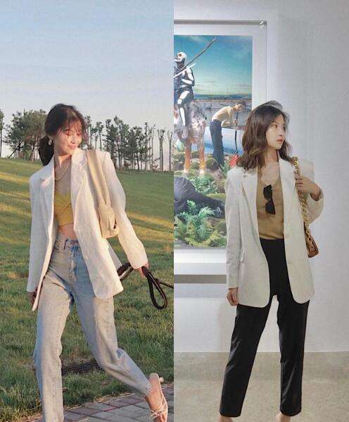 米白色的西装外衣,出去你来更显得温柔大方。米白色不像纯白色那么新鲜老到,却也愈加温柔大方。正在内搭的采选上,米白色也是较量百搭的。不管是露脐的上衣,如故修身的针织衫,搭配米白色西装外衣,都黑白常爽利又摩登的制型。搭配一双高跟鞋子,更是自然晋升气场。