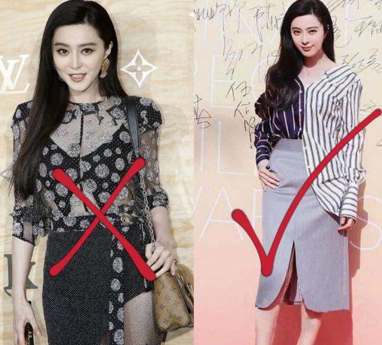 梨型身体的妹子正在拣选半身裙格局时,开始要pass掉的便是带有侧面高开衩计划的裙装,这类型的裙装会将腿粗和不美的腿型差错暴呈现来,具有再壮大的盛世美颜也不行云云放肆呀,结果谁都念显现的完满少少。好比以下穿搭效益对照:左图中的范冰冰穿了一件侧面高开衩的半身裙,强悍的大腿被显现的形容尽致,不只抹杀了底本的性感气味,并且具有的盛世美颜也被清扫了几分靓丽感;再来看右图中的穿搭,右图中的女神穿了一件前面低开衩的半身裙,彰显女人味的同时还能美妙自然地规避掉梨形身体的差错,显瘦又知性温婉,可谓一箭双鵰。