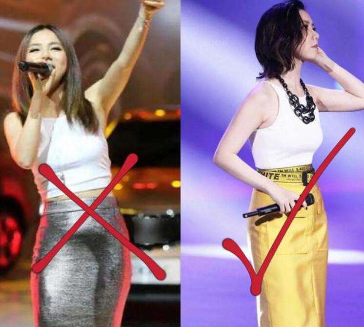 低腰的半身裙关于梨型身体的妹子来说无疑是一种灾难,会让你嫌得又矮又胖,假若再到场少少反光金属元素做为色调,那就真会成为“大型翻车”现场,是以穿对衣服真的太紧张。好比以下穿搭效益对照:左图中的邓紫棋身穿一件带有银灰色的低腰半身裙,低腰版型和反光的特色成为了爆雷的要紧缘由。反光会让衣服的外外看起来颜色亮度不服均,低腰也会让腹部更收紧,从而外寓目起来让底本不完满的身体显得特别有肉感,看起来又土又俗;再来看右图中的穿搭,同样的白色短款吊带,健身方法下半身只是换了一件高腰版型、哑光面料亮色些的半身裙,团体给人一种整洁整洁,新鲜靓丽的感应,而且显瘦显高还很显气质,让情面不自禁念众瞄几眼。
