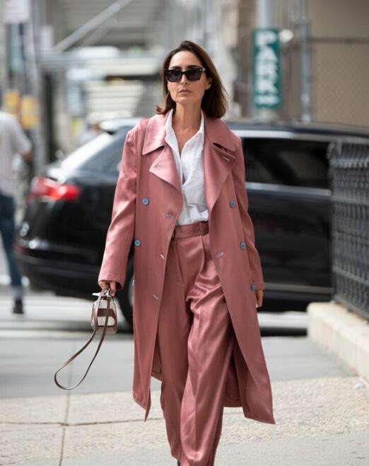 裸粉色也是一种常睹的减龄色,云云的色系穿起来众了几分女性的柔情。可是由于亮度比拟低,于是不会那么闪烁,控制起来也比拟容易简直是不挑肤色的制型。裸粉色的风衣,搭配了裸粉色西裤,更显得爽利高级。内搭白色衬衣,新颖简约。通盘人的气质也是比拟高级大方的,是一种值得鉴戒的穿搭制型。