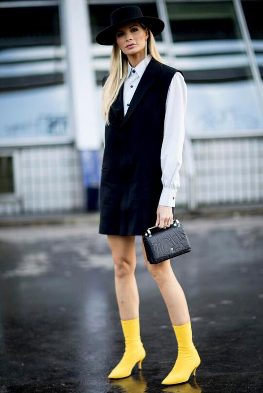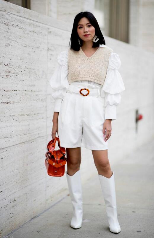 干净的白衬衫,可能使少许短款的版型,固然是对比干净的版型安排,却可能照样穿出风仪。就像这组搭配中,简约的白衬衫搭配了玄色针织衫的穿搭方法,更显得特殊的文雅干净。修身的玄色针织马甲,衬得衣着者身体尤其高挑,搭配了一双明黄色短靴,更显得文雅干净。