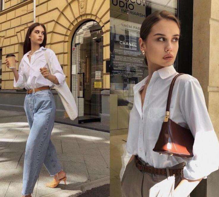 白衬衣与牛仔裤,是常睹的穿搭组合。倘若思要愈加高级一点的话,可能采用挺括性比力强的白衬衣,搭配质感实足的牛仔裤。凹出模范极简风也是比力浅易的,咱们只须要正在腰间装饰一条棕色腰带,不但勾画出更圆满的肉体比例,也愈加细致时尚。小高跟的穆勒鞋,干净大方,尽显女性魅力。