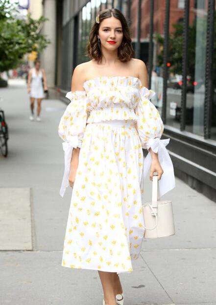 固然说碎花裙的元素,是度假风中必弗成少的穿搭。可是常睹的碎花裙城市选取少许薄纱的元素,轻飘曼妙的身姿大师都看腻了。美食搭配!因此这光阴可能选取少许相对挺括的态度面料,气质上也加倍高级温婉。搭配一字肩的连袖名目,加倍喜悦的同时也利害常减龄可爱的。